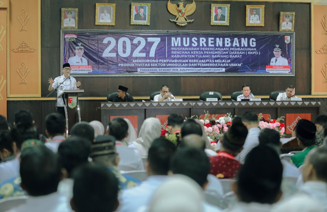 Musrenbang tersebut mengusung tema “Mendorong Pertumbuhan Berkualitas melalui Produktivitas Sektor Unggulan dan Pemberdayaan UMKM.” Kegiatan ini turut dihadiri Sekretaris Daerah Provinsi Lampung Marindo Kurniawan, Bupati Tulang Bawang Barat Novriwan Jaya, Wakil Bupati Nadirsyah, unsur Forkopimda, para camat, lurah, serta kepala tiyuh se-Kabupaten Tulang Bawang Barat.