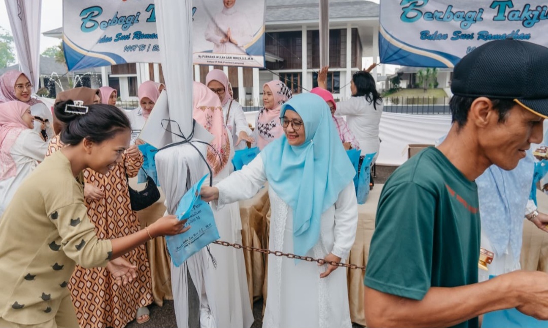 PEMBARUAN.ID — Tim Penggerak PKK Provinsi Lampung bersama Dharma Wanita Persatuan (DWP) Provinsi Lampung kembali menggelar kegiatan berbagi takjil Ramadan 1447 Hijriah dengan membagikan 300 paket takjil kepada masyarakat di depan Mahan Agung, Bandar Lampung, Minggu (01/03/2026).