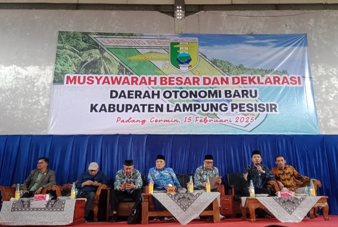 PEMBARUAN.ID – Masyarakat dari lima kecamatan di Kabupaten Pesawaran dan dua kecamatan di Kabupaten Tanggamus resmi mendeklarasikan pembentukan Daerah Otonomi Baru (DOB) Kabupaten Lampung Pesisir dalam sebuah Musyawarah Besar yang digelar, Minggu (16/02/2025).