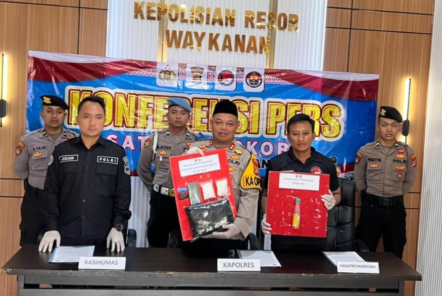 “Penangkapan berawal pada Selasa, 3 Maret 2026 sekitar pukul 08.50 WIB. Anggota Satresnarkoba Polres Way Kanan mendapatkan informasi dari masyarakat mengenai adanya peredaran narkotika jenis sabu di Kampung Pisang Baru, Kecamatan Bumi Agung,” ujar Kapolres saat ekspose kasus di Mapolres Way Kanan, Jumat (06/03/2026).
