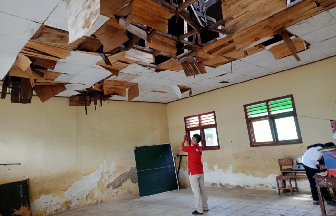 Rabu (11/09/2024) siang itu, di bawah teriknya matahari, tampak bangunan sekolah yang berdiri seolah meminta belas kasihan. Plafon atap di salah satu ruangan hancur berantakan, membuatnya tak bisa lagi digunakan.
