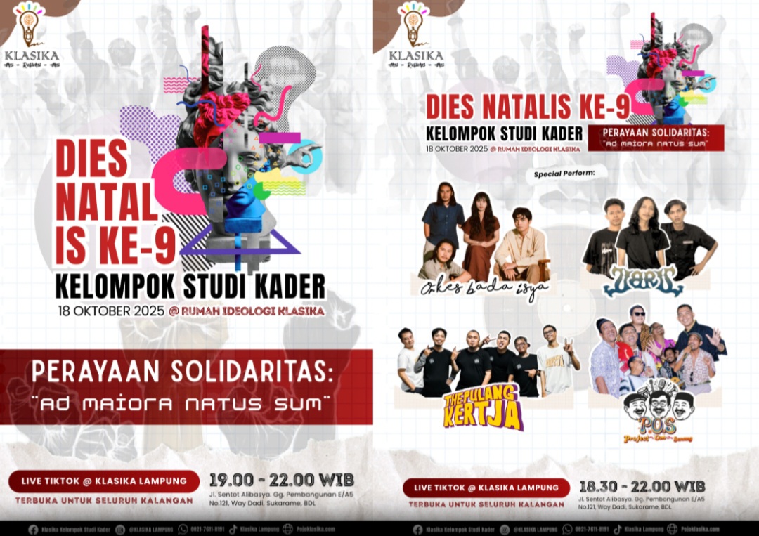 PEMBARUAN.ID — Kelompok Studi Kader (KLASIKA) Lampung akan merayakan Dies Natalis ke-9 dengan mengusung tema “Perayaan Solidaritas: Ad Maiora Natus Sum” di Rumah Ideologi KLASIKA, Sukarame, Bandarlampung, pada Sabtu malam, 18 Oktober 2025.