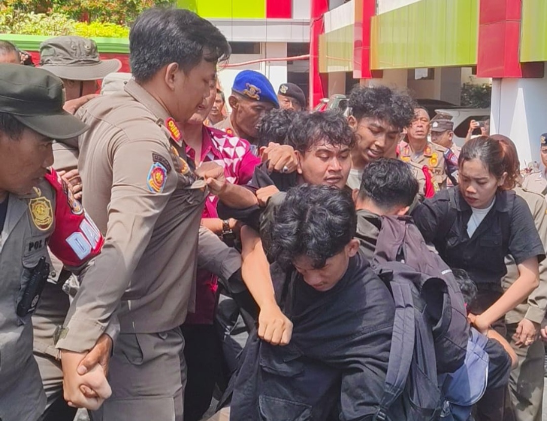 Sebuah video yang diterima awak media menunjukkan petugas berseragam menarik paksa seorang pemuda dari kerumunan, lalu mendorongnya hingga jatuh di depan gerbang.