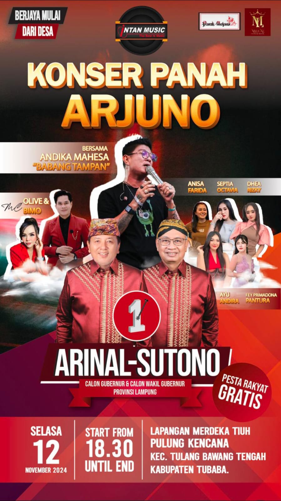 PEMBARUAN.ID – Pasangan calon gubernur dan wakil gubernur Lampung, Arinal Djunaidi – Sutono (Ardjuno), akan menggelar pesta rakyat di Lapangan Merdeka, Tiyuh Pulung Kencana, Kabupaten Tulang Bawang Barat, pada 12 November 2024.