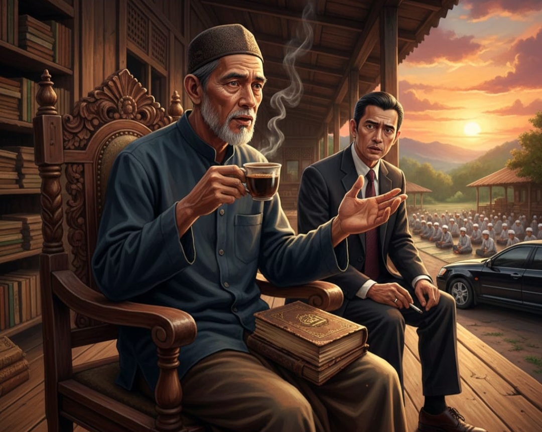 Suara deru mobil dinas memecah kesunyian sore di pekarangan pesantren. Sebuah Toyota sedan hitam mengilap, simbol kekuasaan dan birokrasi, berhenti tepat di depan kediamannya.