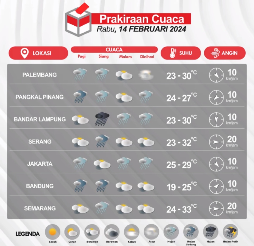PEMBARUAN.ID – Badan Meteorologi, Klimatologi, dan Geofisika (BMKG) Stasiun Meteorologi Radin Inten II memprakirakan sebagian wilayah Lampung bakal diguyur hujan pada hari pemungutan suara, Rabu (14/02/2024).