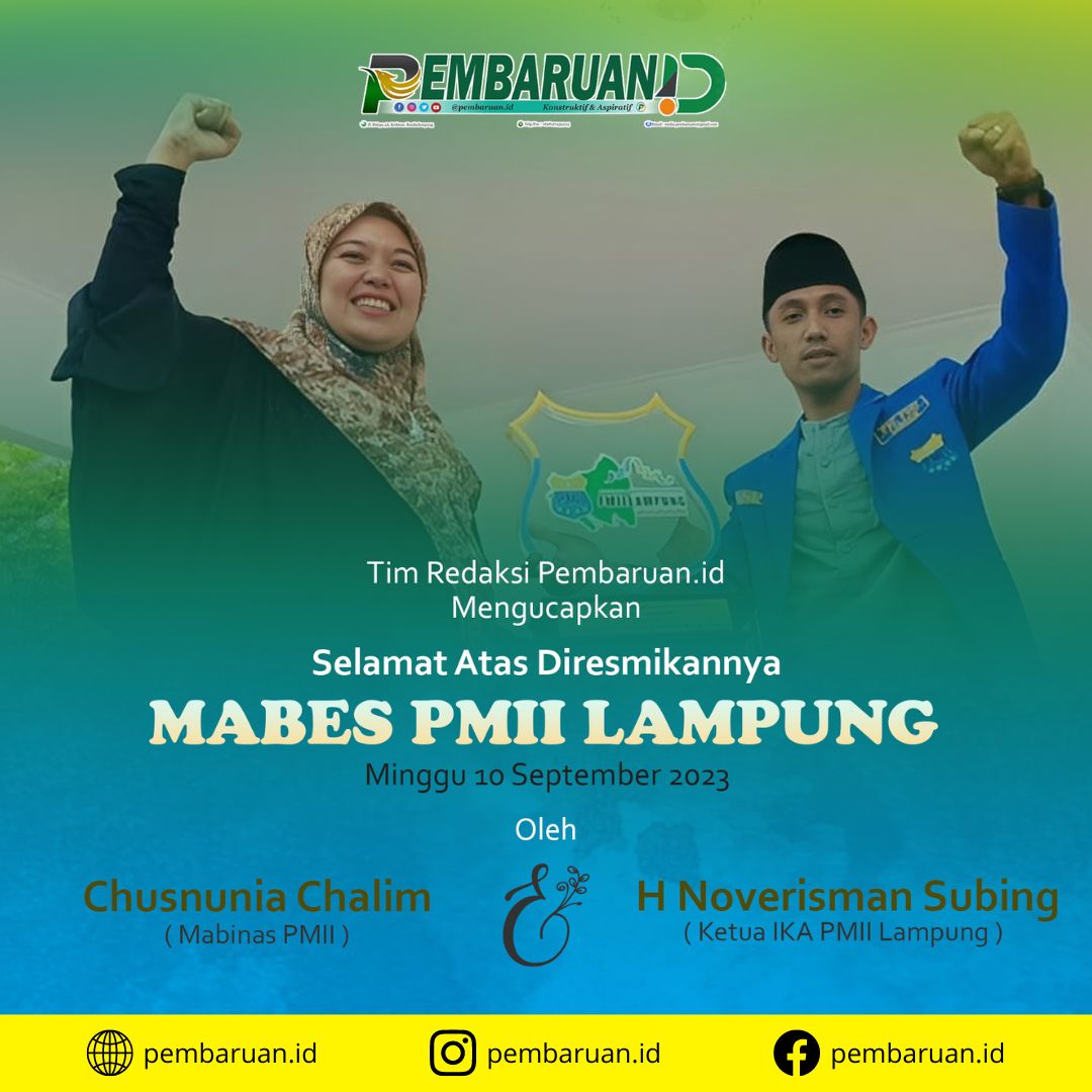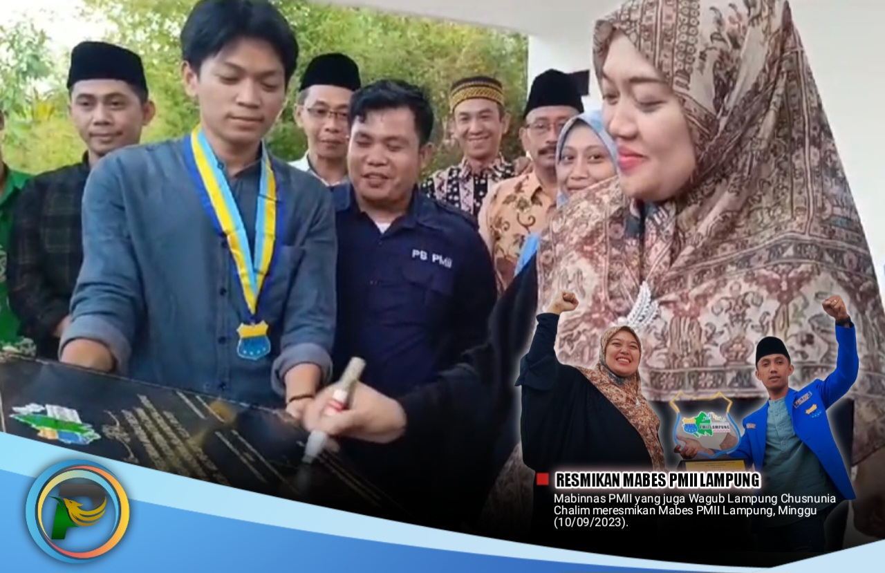 PEMBARUAN.ID – Wakil Gubernur Lampung sekaligus Mabinas PB PMII Chusnunia Chalim menandatangani prasasti sebagai tanda diresmikannya Markas Besar (Mabes) Pergerakan Mahasiswa Islam Indonesia (PMII) Lampung di Jl Pramuka, Bandarlampung, Minggu (10/09/2023).
