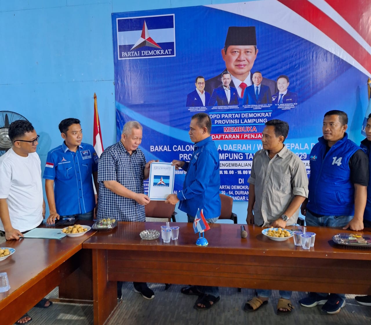 Sekretaris Tim Penjaringan Partai Demokrat Provinsi Lampung, Toni Mahasan mengatakan terdapat dua pendaftar, satu pendaftar untuk balon Gubernur dan satu untuk balon wakil Gubernur.